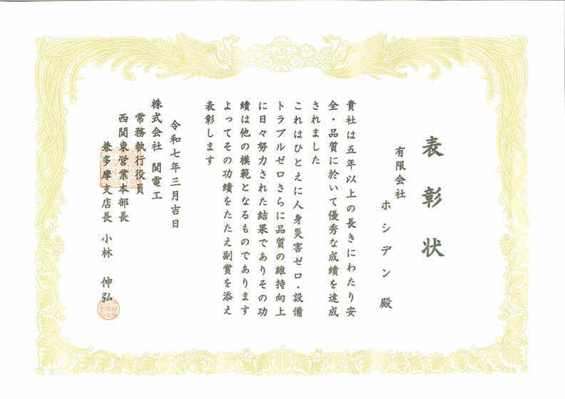 2023年8月23日 関電工様より 「2022年度 支店長表彰」にて社員1名が表彰されました